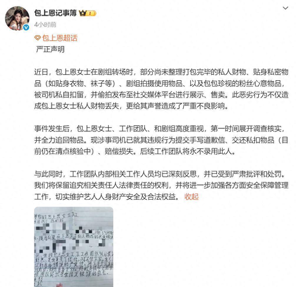该声明表示,事件发生后,包上恩女士、工作团队和剧组高度重视,第一时间展开调查核实,并全力追回物品。现涉事司机已就其违规行为提交手写道歉信、交还私扣物品(目前仍在清点核验中)、赔偿损失。后续工作团队将永不录用此人。
